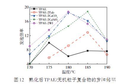 图12展示了4种TPAE/无机粒子泡沫熟化后的发泡倍率随温度变化的情况。结果表明,相较于纯TPAE,4种复合物泡沫的最终发泡倍率均有所增加,其中TPAE/CaCO3、TPAE/CaSiO3及TPAE/WI显著提升。已知影响发泡倍率的主要因素有发泡剂的溶解度和聚合物的流变性能。由于无机粒子的添加量较少,基本不会影响CO2在复合物中的溶解度及流变性能。因此TPAE/无机粒子复合物的初始发泡倍率与纯TPAE基本一致,但无机粒子的添加会促进TPAE形成开孔结构,尤其是CaCO3、CaSiO3以及WI可使TPAE形成高开孔率的泡沫,减小了泡沫的收缩,使得完全熟化后的发泡倍率远高于TPAE,大大提高了TPAE的发泡性能。