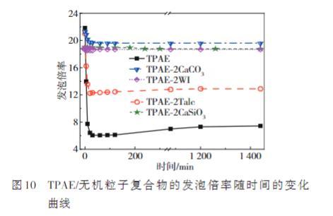 弹性体发泡材料的收缩问题是普遍存在的,这严重限制了泡沫的实际应用。分析了185℃时TPAE/无机粒子复合物泡沫的尺寸稳定性,结果如图10所示,可以发现,纯TPAE的发泡倍率虽然高达22倍,但是由于负压和材料自身刚性不足的影响,发泡倍率随时间急剧下降,TPAE泡沫出现严重的收缩变形。而无机粒子的加入可提高TPAE/无机粒子复合泡沫的尺寸稳定性。相比较于Talc,CaCO3、CaSiO3、WI的改善效果尤其显著,这3种复合物泡沫的发泡倍率随时间基本不发生变化,收缩现象明显改善。