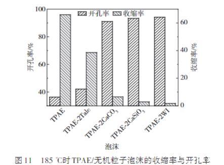 图11 185℃时TPAE/无机粒子泡沫的收缩率与开孔率