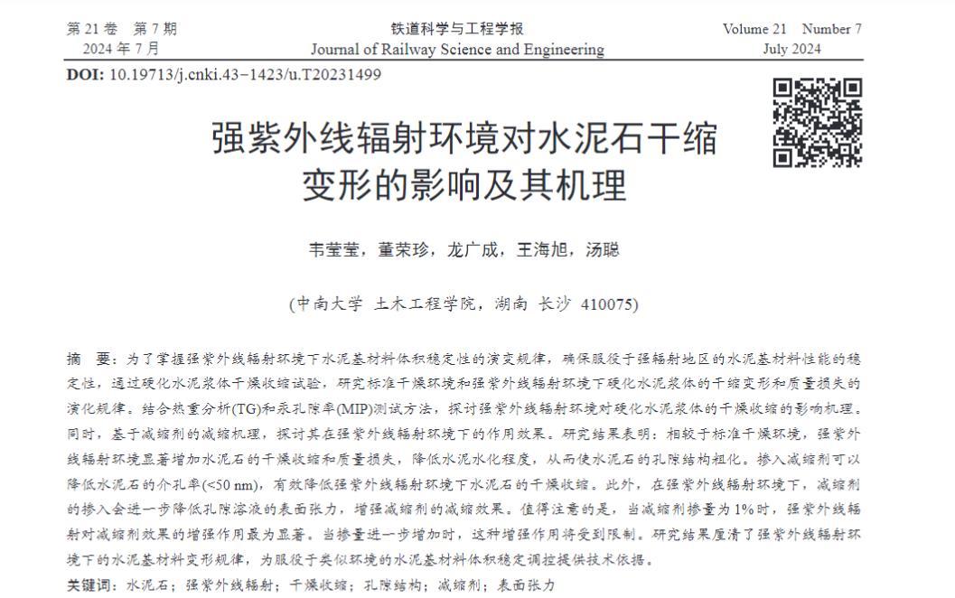 当掺量进一步增加时,这种增强作用将受到限制。研究结果厘清了强紫外线辐射环境下的水泥基材料变形规律,为服役于类似环境的水泥基材料体积稳定调控提供技术依据。