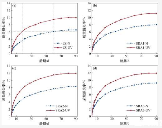 暴露在强紫外线辐射环境中的各组试样的质量损失率均明显大于标准干燥环境中试样的质量损失率。在3~21 d龄期内,各组试样在强紫外线辐射环境中的质量损失增长速率明显大于其在标准干燥环境中的质量损失增长速率。以基准组(JZ)为例,强紫外线辐射环境下水泥石在18 d龄期时的质量损失率达到标准干燥环境下水泥石在60 d龄期时的质量损失率(稳定值),并最终在90 d龄期时,JZ-UV组的质量损失率达到了JZ-N组的1.5倍。这是强紫外线辐射的“光化学作用”引起的。当水分子吸收光子后,内部的电子会发生能级跃迁,形成不稳定的激发态,并发生离解反应,使H—O键断裂生成H+和HO-,从而加速水分子的运动,促进了水泥石表面的干燥,增大了水泥石体系内部与外部环境的湿度梯度,导致水泥石中的水分快速散失。