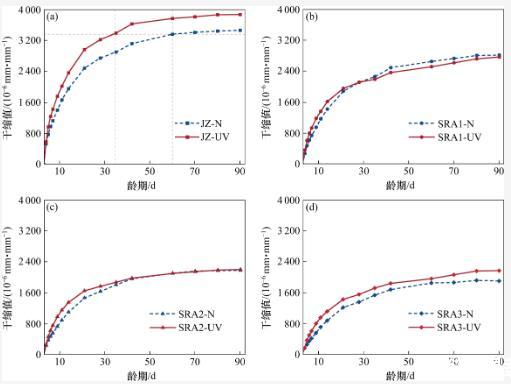 从图3中可以观察到,随着龄期的延长,干缩曲线SRA2-UV逐渐接近于干缩曲线SRA3-UV,而SRA3-UV的干缩值没有进一步降低。这表明上述分析是合理的。在强紫外线辐射下,当减缩剂的掺量超过3%时,其孔隙溶液中的SRA浓度超过临界浓度(CMC),进一步增大掺量不能增强SRA在该应用环境中的减缩效果。