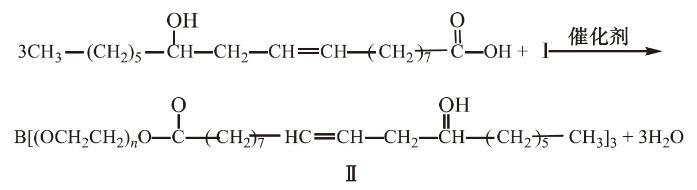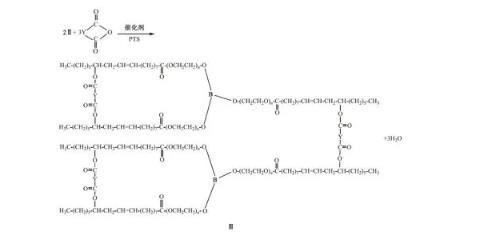 待反应液冷却至50℃,向反应液中加入0.12 mol蓖麻油酸与催化剂对甲基苯磺酸(PTS的质量为蓖麻油、聚乙二酸与硼酸总质量的1%),升温至140℃,在负压下进行反应,至体系酸值不变,酯化过程如下所示: