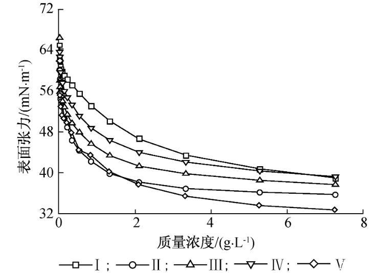 由表1可知,5种高分子表面活性剂的重均相对分子质量在1 643~5 267之间,萜烯马来酸酐与聚乙二醇2 000反应得到的表面活性剂重均相对分子质量最大,表面活性剂的聚合度随着聚乙二醇相对分子质量的增大呈先增大后减小的趋势,化合物Ⅱ聚合度最大,为4.9。