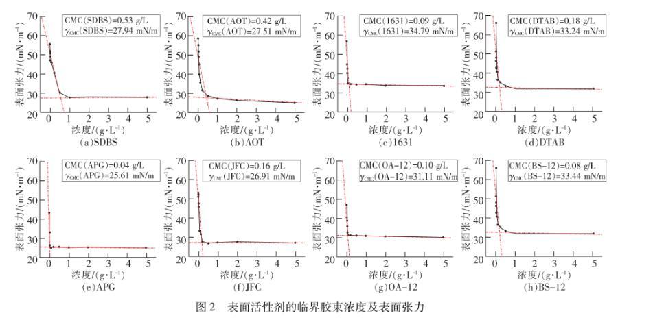 由图2可见,8种表面活性剂溶液表面张力随浓度变化的趋势大体上相同,但其临界胶束浓度及表面张力有较大差别。溶液临界胶束浓度越小,说明表面活性剂分子在溶液中形成胶束的能力越强。8种表面活性剂的临界胶束浓度主要集中在浓度为0.1~0.4 g/L左右,其中APG的临界胶束浓度最小为0.04 g/L,SDBS的最大为0.53 g/L,8种表面活性剂形成胶束能力由强到弱排序为:APG>BS-12>1631>OA-12>JFC>DTAB>AOT>SDBS,总体呈现出两性型>非离子型>阳离子型>阴离子型的规律。溶液的γcmc值越小,表面活性剂降低表面张力的能力越强,阴离子和非离子型的4种表面活性剂γcmc值均较低,其中APG降低表面张力能力最强,γcmc值仅为25.61 mN/m,比水降低了65.15%。而阳离子和两性型的表面张力较高,均在31.00 mN/m以上,1631降低表面张力的能力最弱,表面张力为34.79 mN/m。8种表面活性剂降低表面张力的能力由强到弱依次排序如下:APG>JFC>AOT>SDBS>OA-12>CTAB>BS-12>1631,总体而言,非离子型>阴离子型>两性型>阳离子型。APG的临界胶束浓度和表面张力都最低,这可能是因为APG分子为环状结构,环状结构的碳原子上连接有醇羟基,这些醇羟基与水分子之间存在强相互作用,且在水溶液中溶解度很高,因此有效降低了溶液的表面张力,也更易形成胶束。