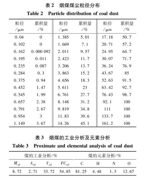 利用激光粒度分析仪对实验用的煤尘粒径分布特征测试,结果见表2。