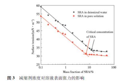 由图3还可知,SRA在去离子水中混合时,临界SRA浓度约为11.2%,当SRA在合成孔溶液中混合时,临界SRA浓度约为7.3%.这意味着溶液中的离子会使得临界SRA浓度降低。对于混凝土,实际的内部离子浓度更高,而临界SRA浓度取决于孔隙溶液的离子组成,因此,实际的临界SRA浓度更低。