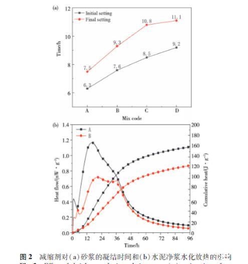 图2减缩剂对(a)砂浆的凝结时间和(b)水泥净浆水化放热的影响