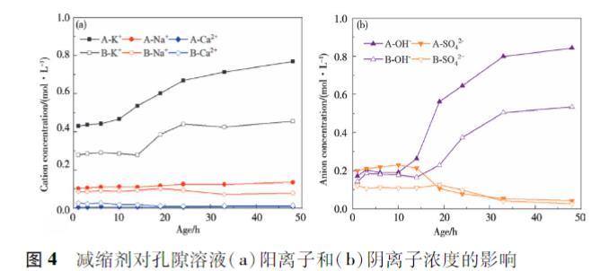 图4减缩剂对孔隙溶液(a)阳离子和(b)阴离子浓度的影响