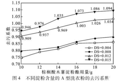 以棕榈酸酯淀粉完全替代标准洗衣粉配方中的LAS,调整淀粉用量制取一系列不同淀粉含量的A型洗衣粉,洗衣粉的洗涤实验结果见图4。