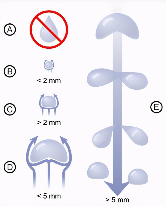 雨滴在被分割之前保持着的最大尺寸被称作为「雨滴临界破碎尺寸」,物理学则用「临界半径」来表示,在各种不同的气流条件下,「雨滴临界破碎尺寸」是不同的: