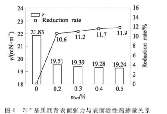 使用改进差分毛细管法,得到不同表面活性剂掺量wW2下B+W2的表面张力值,见图6.由图6可见:未掺表面活性剂时,70#基质沥青表面张力为21.83mN/m,表面活性剂掺量为0.2%时B+W2的表面张力为19.51mN/m,表面张力显著降低,降幅为10.6%;表面活性剂掺量在0.3%——0.5%,表面张力在19.24——19.39mN/m,与70#基质沥青相比,表面张力降幅趋缓,降低幅度为11.2%——11.9%.