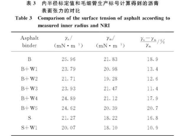 表3内半径标定值和毛细管生产标号计算得到的沥青表面张力的对比