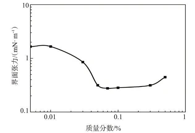 根据吉布斯吸附理论,为了达到超低油/水界面张力,表面活性剂分别与油相和水相发生强的相互作用并且在油水界面达到饱和吸附。这要求表面活性剂同时具有大的亲水基和疏水基。不同浓度的表面活性剂TPHS溶液与大庆原油间的界面张力如图3所示,随着表面活性剂TPHS质量分数的增大,界面张力先减小后缓慢增大,在较大的浓度范围内可保持在10-1mN/m数量级。TPHS质量分数为0.07%时,界面张力达到最低,为0.276 mN/m。TPHS具有较好的降低油水界面张力的能力。