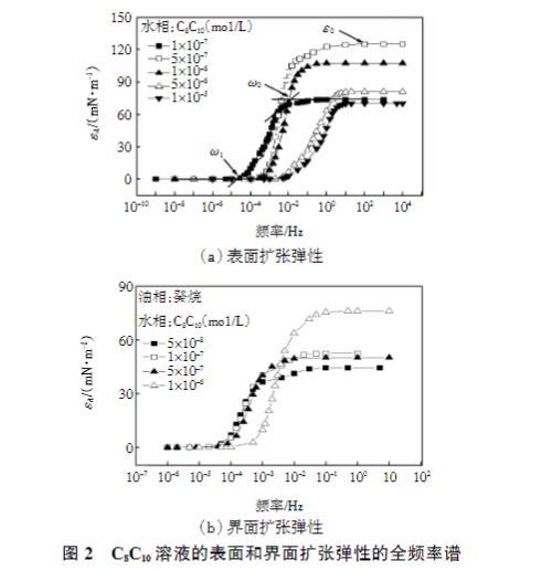 本文对界面膜施加扩张/压缩形变,监测了界面张力跃迁后的衰减特性,计算得到界面膜的弹性。C8C10溶液的表面和界面扩张弹性的全频率谱如图2所示。