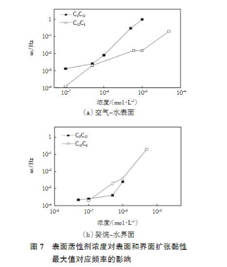 图7表面活性剂浓度对表面和界面扩张黏性最大值对应频率的影响