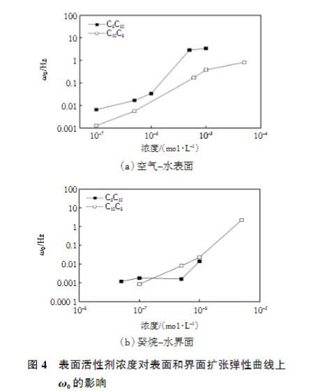 图4表面活性剂浓度对表面和界面扩张弹性曲线上ω0的影响