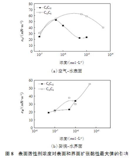 图8表面活性剂浓度对表面和界面扩张黏性最大值的影响