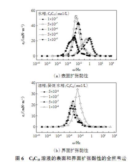 黏性是表征界面吸附膜特性的另一重要参数,直接与弛豫过程的特征频率相关。对于吸附膜,至少存在扩散-交换的弛豫过程,必然表现为一定的黏性。黏性对于界面膜的强度也有很大贡献,具有一定黏性的界面膜有利于泡沫或者乳状液的稳定。C8C10溶液的表面和界面扩张黏性的全频率谱如图6所示。
