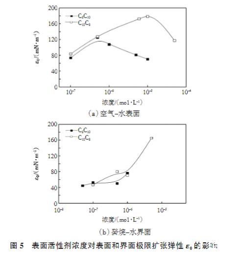 表面活性剂浓度对表面和界面吸附膜极限扩张弹性ε0的影响如图5所示。