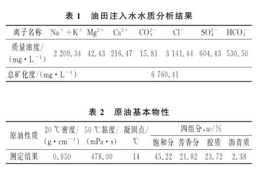 (1)主要材料。脂肪醇聚氧乙烯醚硫酸钠、十二烷基苯磺酸钠、十二烷基硫酸钠,成都科龙化工试剂厂生产;十六烷基二甲基甜菜碱、烷基糖苷APG1214,临沂绿森化工有限公司生产,上述药品均为工业级。实验用水为油田注入水,水质分析结果见表1;实验用油为X油田原油,其基本物性见表2。