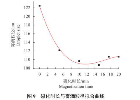 1)在0~500 mT磁场强度范围内,当磁场强度为350 mT、磁化时间为15.0 min时,表面张力最小,为54.0 mN/m,下降14.96%;喷雾雾滴粒径最小,为108.75μm,下降11.20%。溶液表面张力和喷雾雾滴粒径随磁场强度和磁化时长的增加均呈现先下降后回升的趋势,表明只有在特定磁场强度和磁化时长范围内磁化效果才最佳。