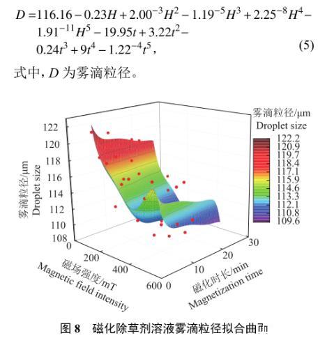 为直观地分析雾滴粒径变化情况,参照“2.2”表面张力数据拟合方法对喷雾雾滴粒径进行多项式拟合、高斯拟合和洛伦兹拟合,但高斯拟合与洛伦兹拟合在达到最大迭代次数之后拟合结果仍不收敛,所以采用多项式拟合模型。多项式拟合结果中,R2为0.833 6,调整后R2为0.787 4,RMSE为2.085 7,这说明拟合函数有意义且拟合程度较高,公式(5)为除草剂喷雾雾滴粒径与磁场强度和磁化时长的函数关系式,图8为磁化除草剂溶液雾滴粒径拟合曲面。