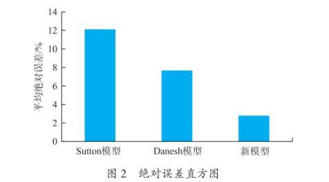 式中,σgw为气水界面张力,mN/m;ρg为气相密度,g/cm3。比较新模型式(4)与Danesh模型、Sutton模型在密度差大于0.4 g/cm3时的误差,如图2所示。Danesh模型平均绝对误差为7.7%;Sutton模型平均绝对误差为12.1%,而新模型平均绝对误差为2.8%,计算精度更高。