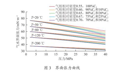 如图3所示为利用新模型绘制的不同温度和压力下的界面张力曲线。从图中可知,压力越大,温度越高,气水界面张力越小;气体相对密度越大,气水界面张力越小。当压力和温度分别为0~40 MPa和20~200℃时,界面张力范围为30~75 mN/m,不能看成常数。