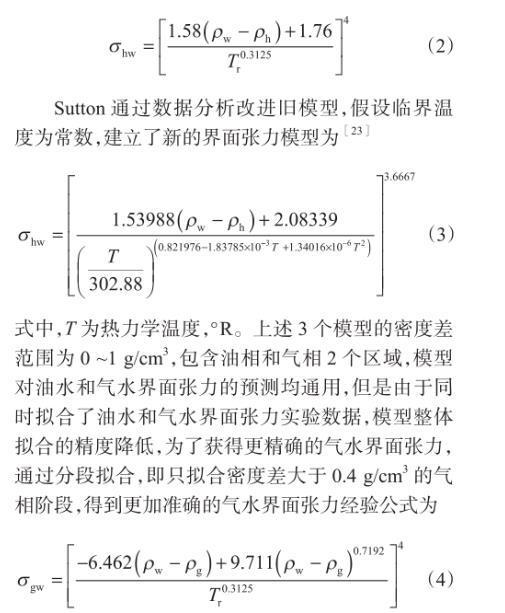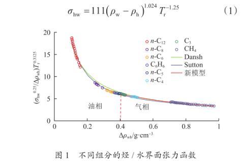 式中,Δρwh为烃水密度差,g/cm3;σhw为烃水、气水或者油水界面张力,mN/m;ρw为水的密度,g/cm3;ρh为烃的密度或者气和油的密度,g/cm3;Tr为拟对比温度。