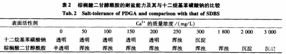 表2棕榈酸二甘醇酰胺的耐盐能力及其与十二烷基苯磺酸钠的比较
