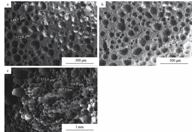 图2不同SDS掺量(a:0.04%;b:0.08%;c:0.1%)的多孔陶瓷样品的SEM照片