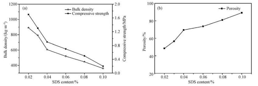 图1为固含量60%、SDS掺量分别为0.02%、0.04%、0.06%、0.08%、0.1%下所制备的多孔陶瓷坯体,经过1190℃、保温2 h烧结后的样品性能。从图中可以看出,多孔陶瓷样品的体积密度和抗压强度随发泡剂掺量的增加而减小。当SDS的掺入量由0.02%提高至0.1%时,样品的密度由890.53降至361.0 kg/m3,抗压强度由1.7下降至0.2 MPa。当SDS溶于水并经过高速搅拌后,SDS分子可以吸附到气液界面上降低表面张力并产生大量的气泡,这些气泡会紧密堆积在一起,气泡之间有液膜将其隔开,将气泡引入到陶瓷浆料中后,陶瓷原料分散在气泡液膜间,形成骨架支撑,干燥后陶瓷原料液相消失,固化形成含孔隙的多孔陶瓷坯体,引入的气泡越多,多孔陶瓷的孔隙率越高,孔壁越薄,陶瓷骨架越细;当气泡的引入量过多时,骨架易发生断裂,此时多孔陶瓷的抗压强度就会降低。