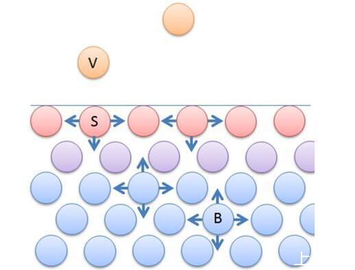 红色为表面分子,下面为内部水分子