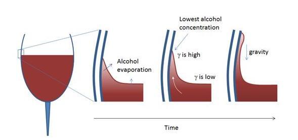 因此,这会在弯月面和葡萄酒与空气间的平坦接触表面之间形成浓度差,随后将造成表面张力梯度(表面张力上大,下小),随着时间推移,使弯月面沿着玻璃杯壁向上移动。