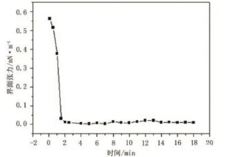 (3)饱和腰果酚聚氧乙烯醚磺酸盐的界面活性。图1为饱和腰果酚聚氧乙烯醚磺酸盐的动态界面张力曲线。从图1可看出,界面张力下降到最低点后基本不变,这是因为当溶液与原油接触时,吸附速率大于脱附速率;随着吸附量不断增加,活性剂分子开始脱附。当活性剂分子在界面上的吸附速率与脱附速率相对平衡时,界面张力保持不变。