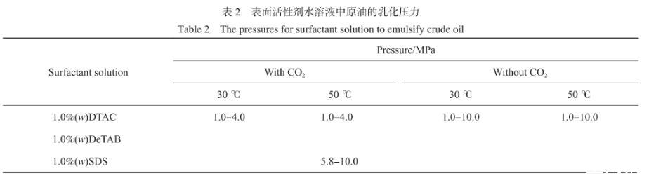 实验中观察到原油的乳化情况与体系压力及CO2存在与否的相关性,表2是CO2存在与CO2不存在条件下,1.0~10.0 MPa范围内,表面活性剂水溶液中原油的乳化压力。50℃时,在DTAC水溶液/原油体系中,CO2不存在时,水静压在1.0~10.0 MPa范围内,始终存在原油的乳化现象。CO2存在时,体系压力低于4.0 MPa时,存在原油的乳化现象,随着CO2压力升高,油水界面张力增大,原油乳化现象消失。说明在DTAC水溶液/原油体系中,CO2的存在不利于原油的乳化。50℃时,在SDS水溶液/原油体系中,CO2不存在时,水静压从1.0 MPa升高至10.0 MPa过程中,始终未出现原油的乳化现象。CO2存在时,体系压力升高到5.8 MPa以上,原油开始出现乳化、拉丝的现象。这说明CO2的存在有利于SDS水溶液乳化原油。其原因如下:一方面CO2的存在降低了SDS水溶液与原油的界面张力;另一方面,CO2通过水相扩散进入原油中,降低了原油的黏度,增强了原油的流动性,同时CO2对原油中轻质组分的萃取,也有助于原油中的轻质组分扩散进入水相。因此高压CO2增强了SDS水溶液对原油的乳化作用。在DeTAB水溶液/原油体系中,油水界面张力较大,无论CO2存在与否,始终没有原油乳化现象的发生。
