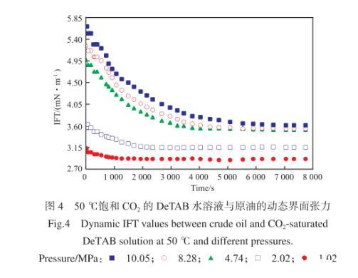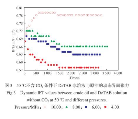 图3为50℃、不含CO2条件下,DeTAB水溶液与原油的动态界面张力。由图3可知,在DeTAB水溶液/原油体系中,油水两相界面张力在初始阶段有较大的变化,在接近平衡界面张力时,变化幅度趋于平缓,油水两相界面张力稳定所需时间在1 500 s左右。