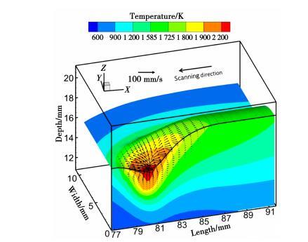 电弧压力是形成熔池凹陷区的驱动力。熔池中心表面的液态金属受到较大的压力,向周围移动。液态金属在熔池中心区域流速最大,而越靠近熔池底部流速越小。这种流动模式允许更多的热量从热源传递到熔池底部,从而导致深度渗透。如图2所示,液态金属在电弧压力的驱动下被推到熔池的后部,并在凝固时形成冠状。