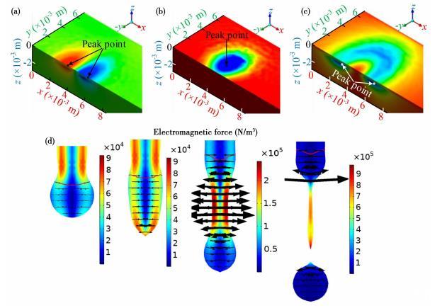 图1电磁力分布:(a—c)熔池内部笛卡尔坐标系x、y、z方向;(d)熔滴内部