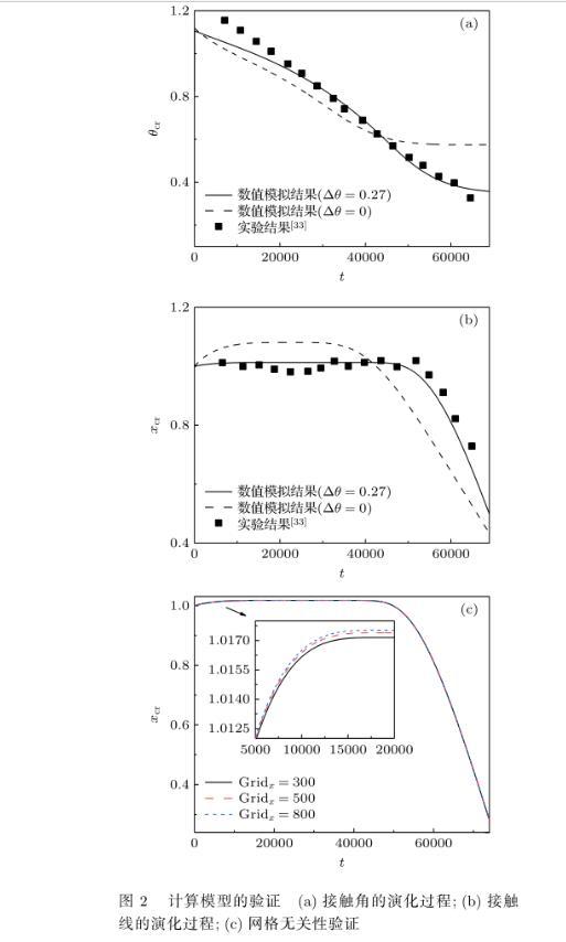 图2计算模型的验证(a)接触角的演化过程;(b)接触线的演化过程;(c)网格无关性验证