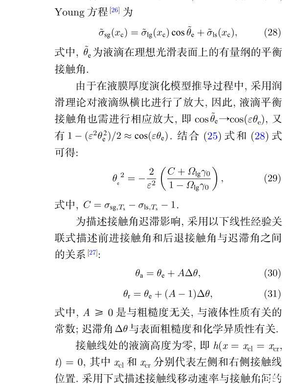 接触线处的液滴高度为零,即h(x=xcl=xcr,t)=0,其中xcl和xcr分别代表左侧和右侧接触线位置.采用下式描述接触线移动速率与接触角间的关系[28](下标c代表接触线):