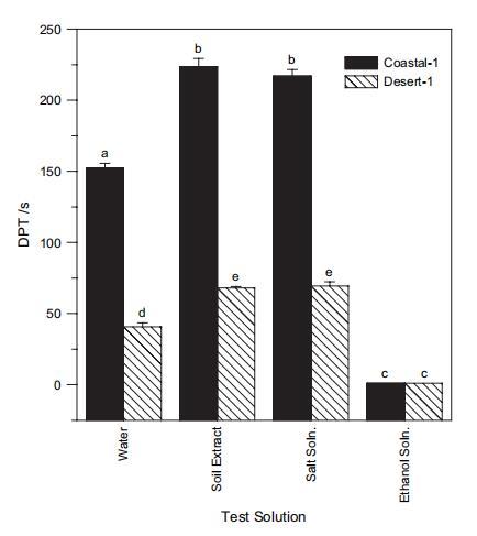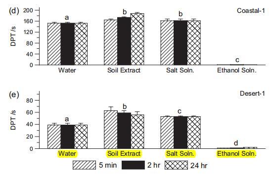 图 4 水滴渗透时间 (DPT),2:1 w : w 2 小时 用于 Desert-1 和 沿海 1 土壤。 误差棒显示重复的标准偏差 滴。 小写字母给出了两侧 t 检验的结果。 不同字母表示均值在 P ¼ 0.01 显着性水平。