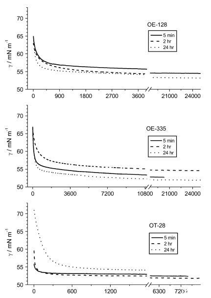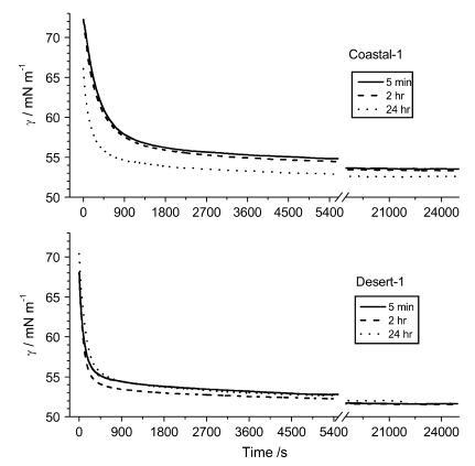 1:1 提取物的动态表面张力测量 表明达到平衡的时间 γLV 从大约 15 分钟到长达 5 小时不等(图 1)。 在所有情况下,都有一个相对较快的初始速度 γLV 的变化,这可能是扩散受限的,和 然后是一段长时间的低利率 γLV 的变化。 平衡达到率低的时期被假定为至少两个过程的结果:(i)不同分子之间的表面竞争 吸附位点; (ii) 表面分子的重排。 时间之间没有明显的关系 实现不同的平衡 γLV 和提取时间 土壤(图 1)。