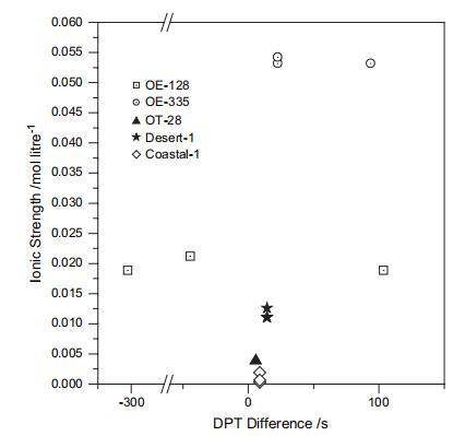 图5 液滴穿透时间(DPT)的差异 盐溶液和水,与盐的离子强度 解决方案。