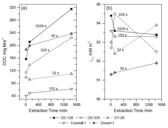 图2 土壤溶解有机碳(DOC)含量(a)和表面张力(γLV)(b) 提取作为提取时间的函数。 水 以秒为单位的液滴穿透时间 (WDPT) 是 标在面板上。