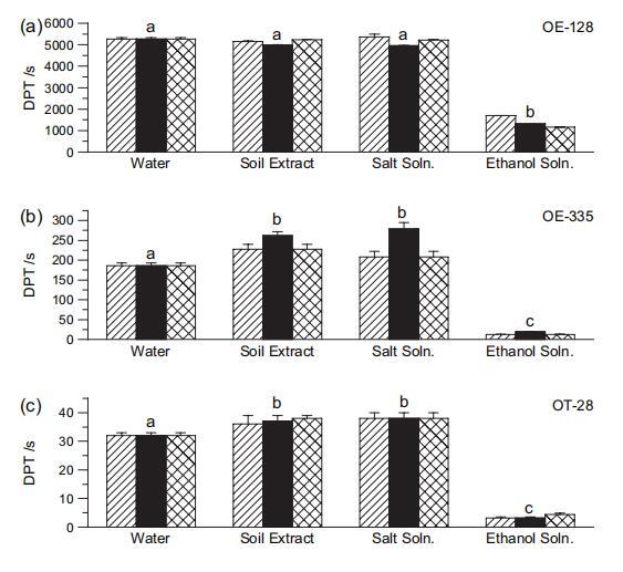 图 3 液滴穿透时间 (DPT) 水、1:1 土壤提取物、盐溶液和不同土壤的乙醇溶液:(a) OE-128; (b) OE-335; (c) OT-28; (d) Coastal-1; (e) 沙漠-1。 误差线显示标准偏差 复制滴。 小写字母给出 两侧 t 检验的结果。 在给定的 窗格中,不同的字母表示均值 在 P ¼ 0.01 显着差异 癌症水平。 对于 t 检验,结果为 三个提取时间(5 分钟、2 小时和 24 小时)一起考虑,因为它们的 γLV 值非常相似(图 2b)。
