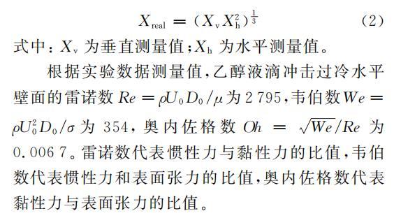 根据实验数据测量值,乙醇液滴冲击过冷水平壁面的雷诺数Re=ρU0D0/μ为2795,韦伯数We=ρU20D0/σ为354,奥内佐格数Oh=We/Re为0.0067。雷诺数代表惯性力与黏性力的比值,韦伯数代表惯性力和表面张力的比值,奥内佐格数代表黏性力与表面张力的比值。