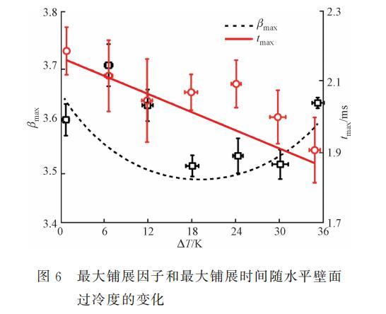 为了探究水平壁面过冷度对液滴冲击的影响机制,定义无量纲铺展因子β=D(t)/D0,其中D(t)为液滴每一时刻的直径,Dmax为液滴能达到的最大铺展直径,对应的最大铺展因子为βmax=Dmax/D0。图5展示了不同水平壁面过冷度下,乙醇液滴冲击水平壁面的铺展因子β随时间的变化曲线。可以看出,乙醇液滴冲击不同过冷度水平壁面均在1.0ms内发生破碎-飞溅,在这段时间内,铺展速率近似为线性,在飞溅后,β突然减小,随后铺展因子继续增,铺展速率逐渐减小,最终趋于0,液滴形态不再发生变化。