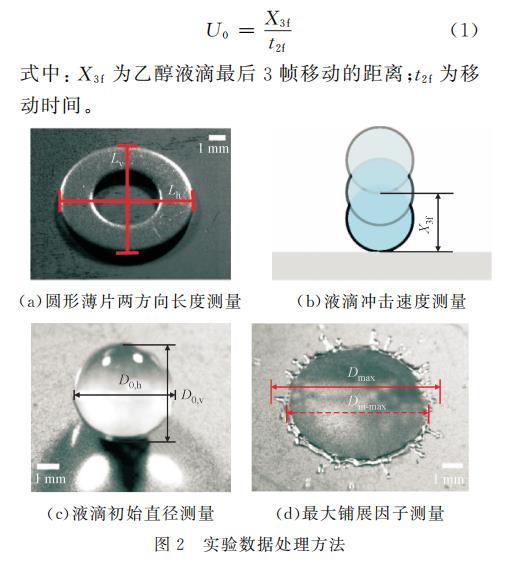 式中:X3f为乙醇液滴最后3帧移动的距离;t2f为移动时间。(a)圆形薄片两方向长度测量(b)液滴冲击速度测量(c)液滴初始直径测量(d)最大铺展因子测量图2实验数据处理方法
